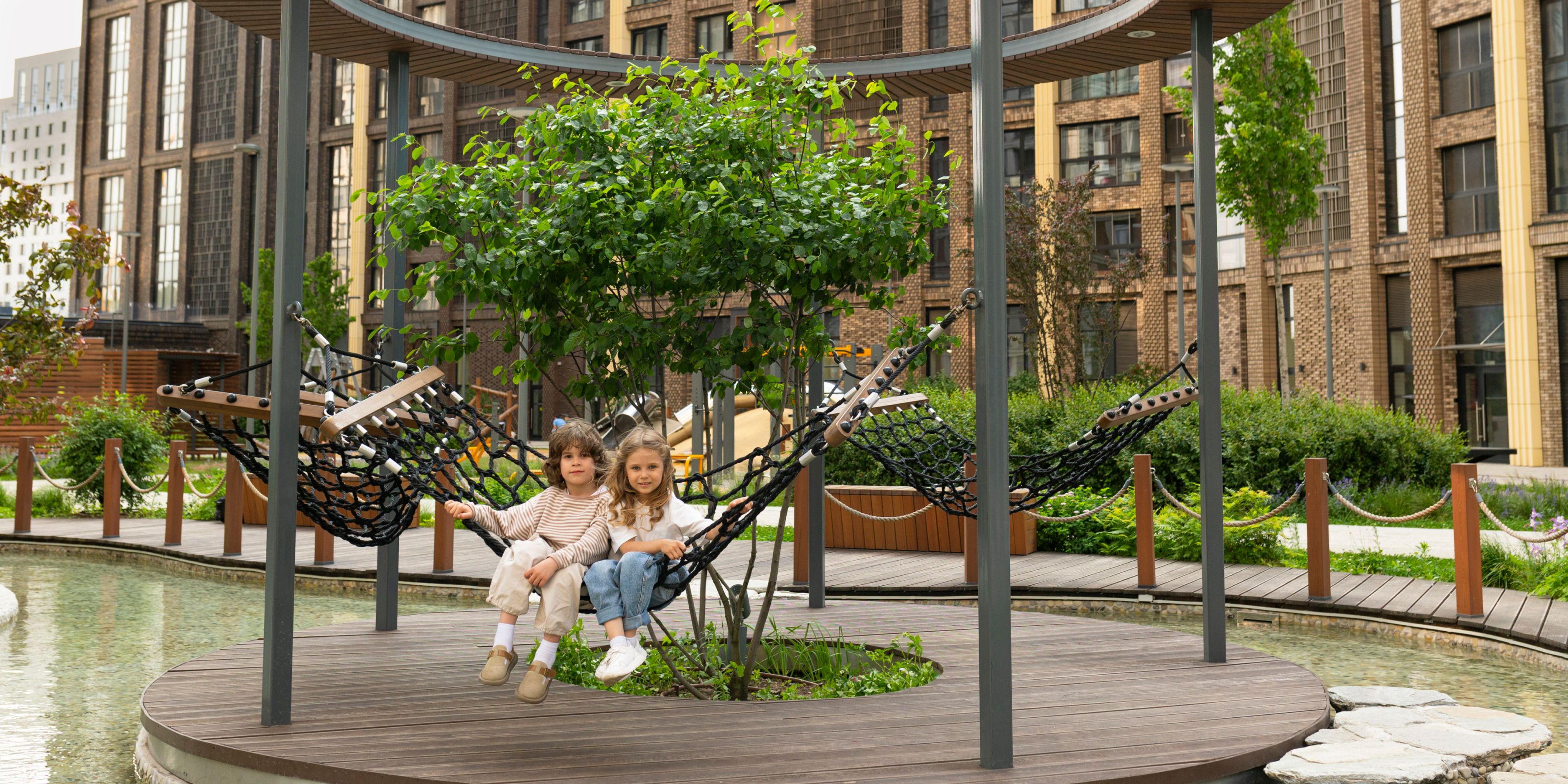 Развивающие пространства для игр расположены на закрытой территории, чтобы юные жители были в безопасности.