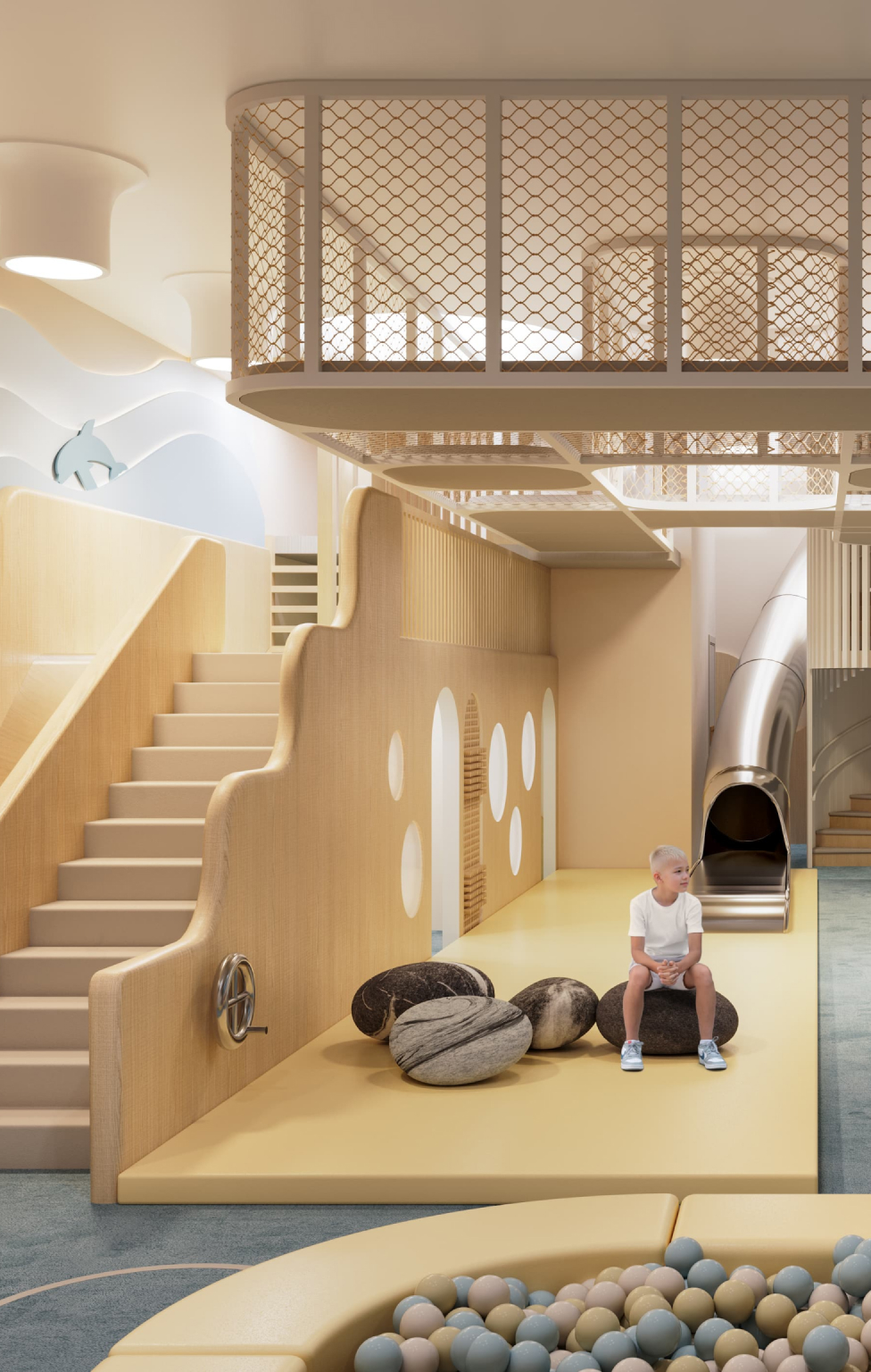 Для детей по нашему фирменному стандарту Kid's Lab создано уникальное игровое пространство, разные части которого объединены общей идеей: здесь всё напоминает о море