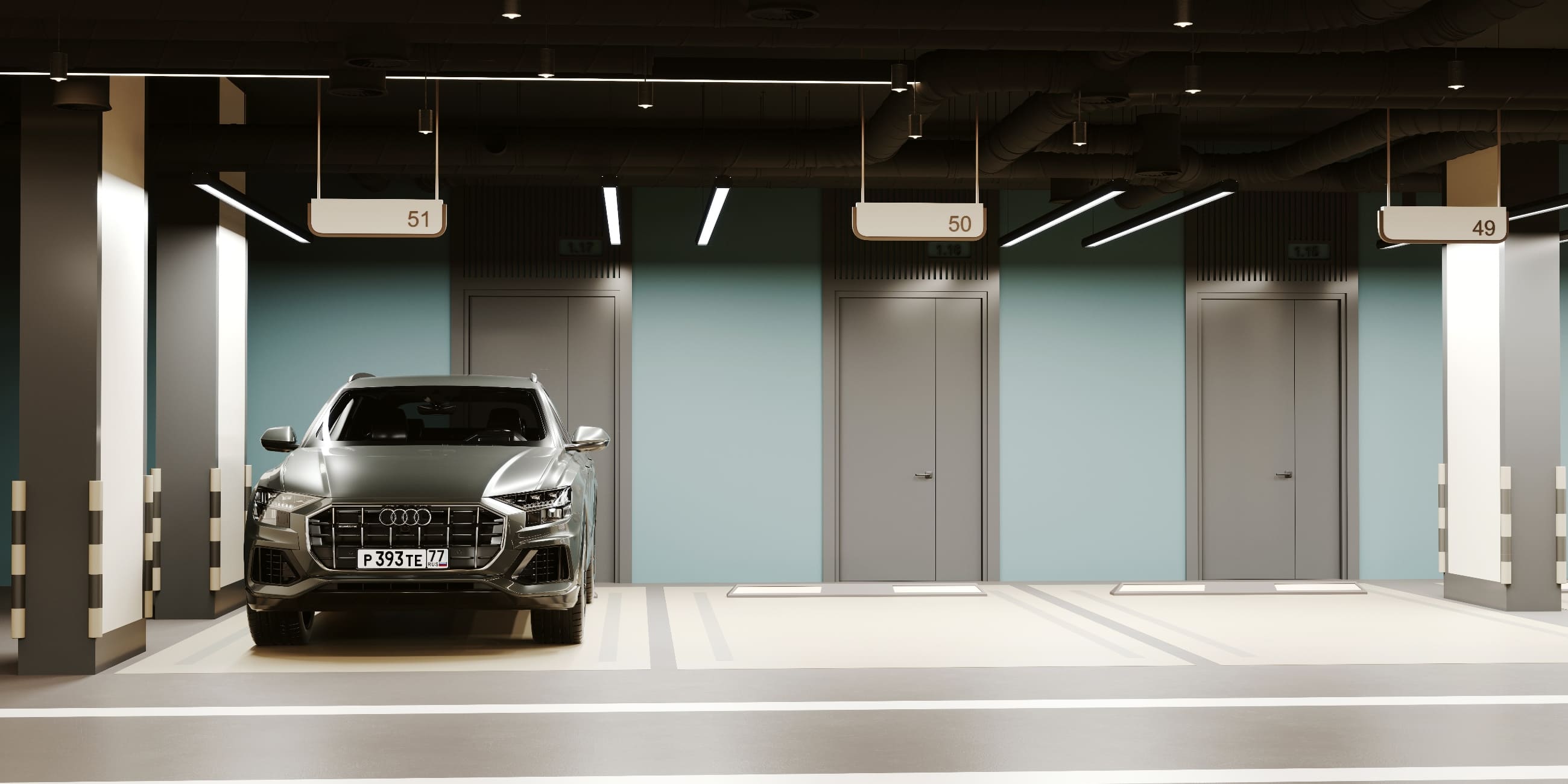 При проектировании мы опирались на реальные габариты автомобилей премиального класса. Поэтому для вас найдётся машино-место оптимального размера, которое позволит с комфортом распахнуть двери и открыть багажник.