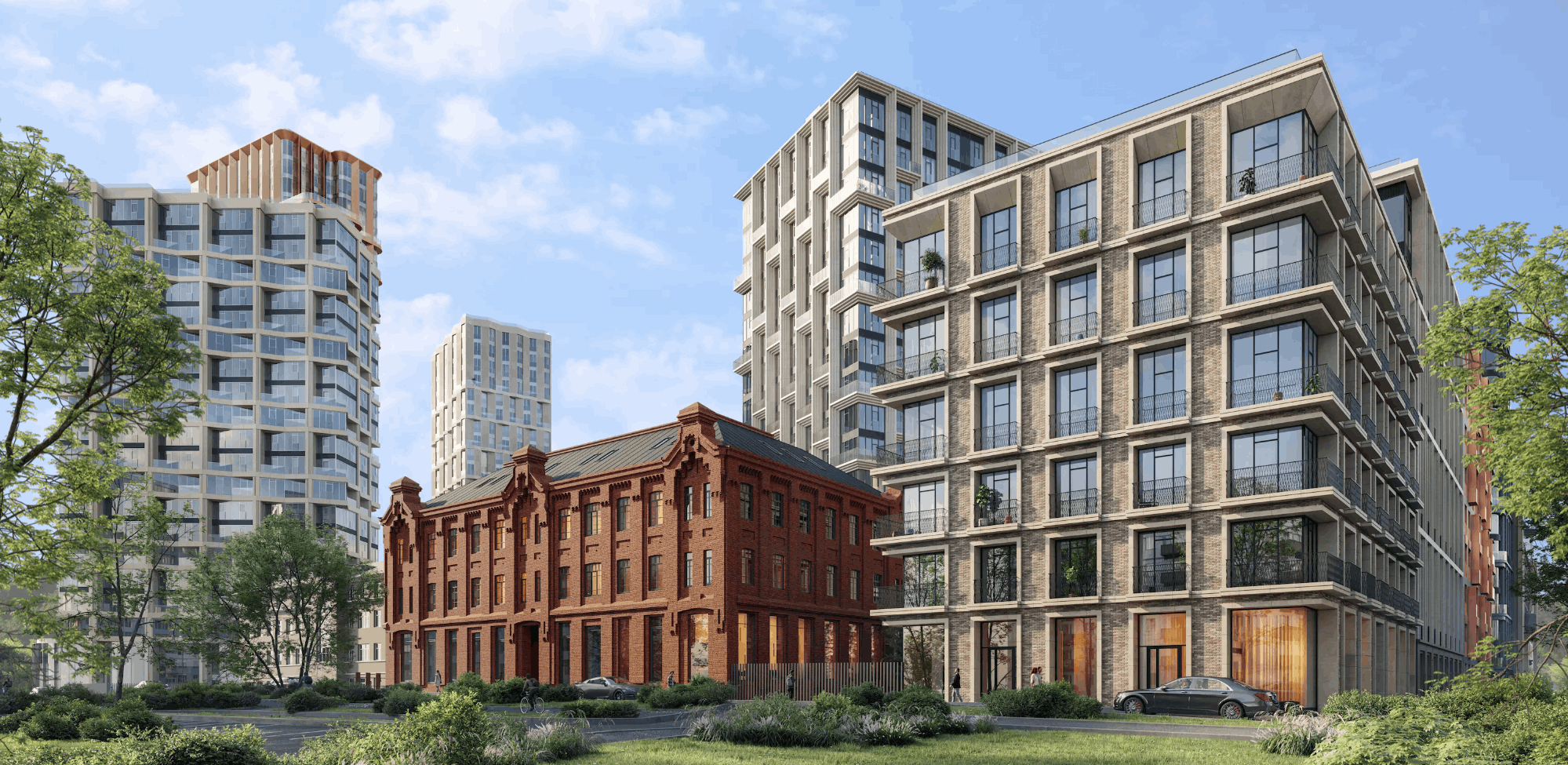 Ансамбль домов построен на контрастном сочетании оттенков, материалов и фактур. Каждый фасад хочется рассматривать в деталях. Благодаря этому квартал деликатно вписывается в архитектурную ткань района.