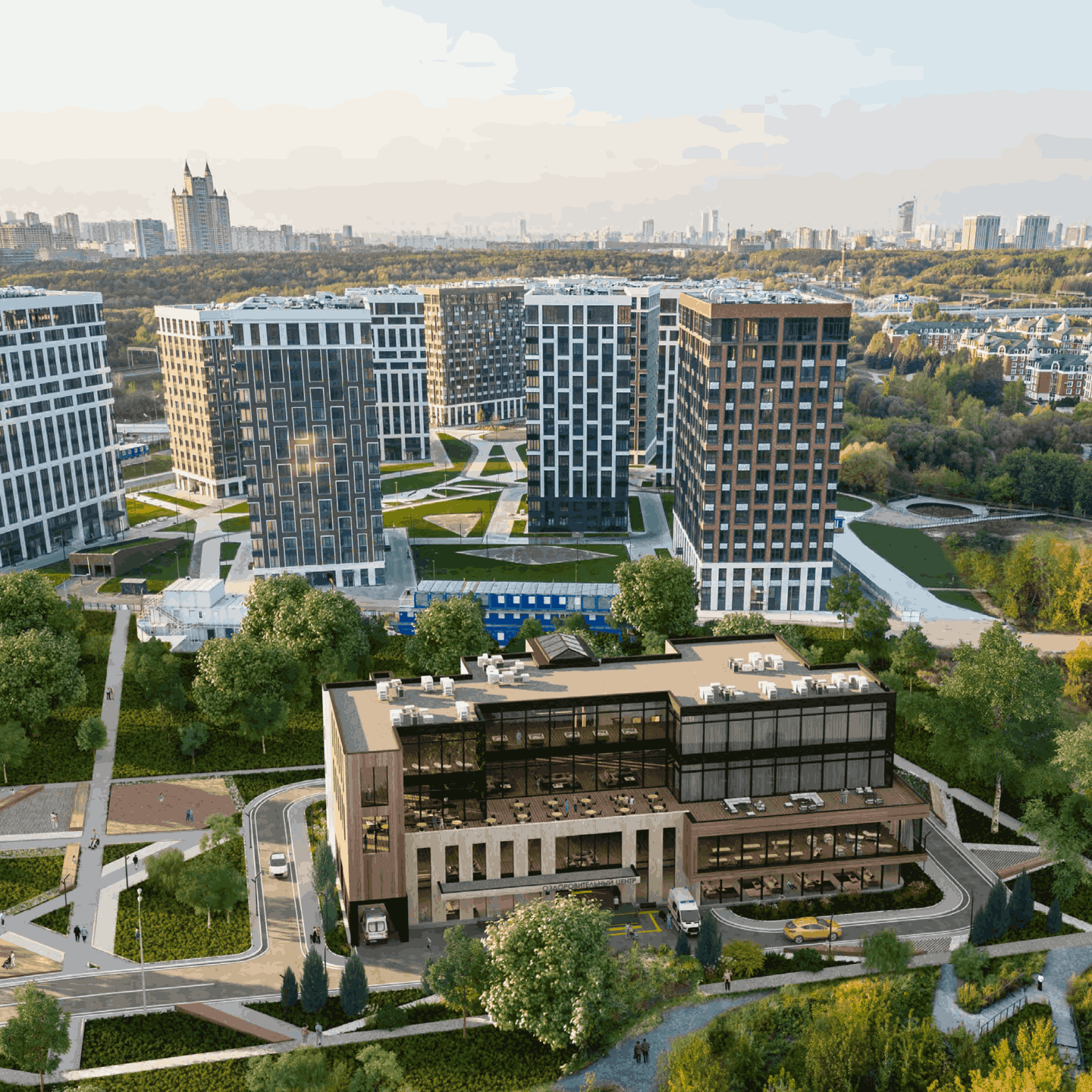 Клубные дома высотой 12-14 этажей расположены на комфортном расстоянии друг от друга, благодаря чему создается ощущение простора и приватности, а из окон открываются великолепные виды.