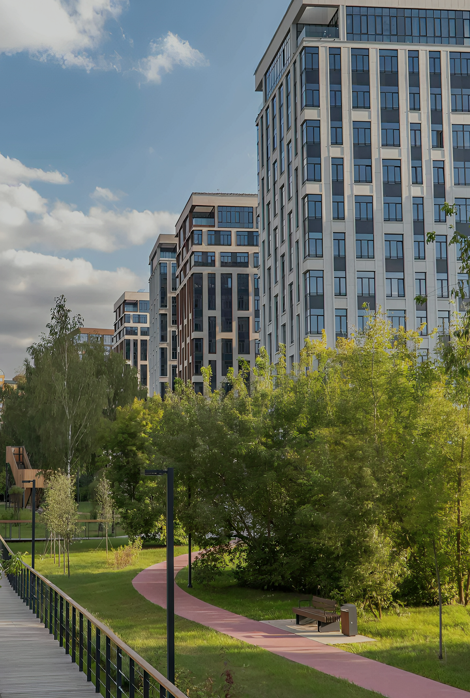 Клубные дома расположены в просторном парке 16 га, вдоль реки, который насыщен возможностями для прогулок, спорта и отдыха.